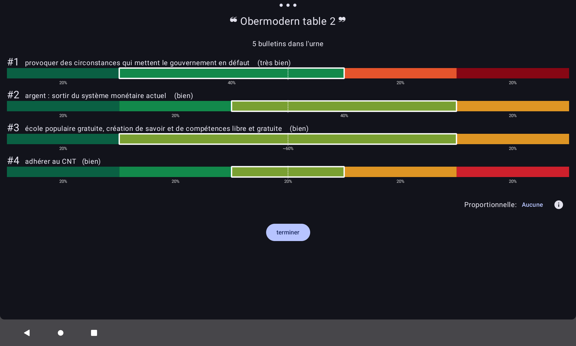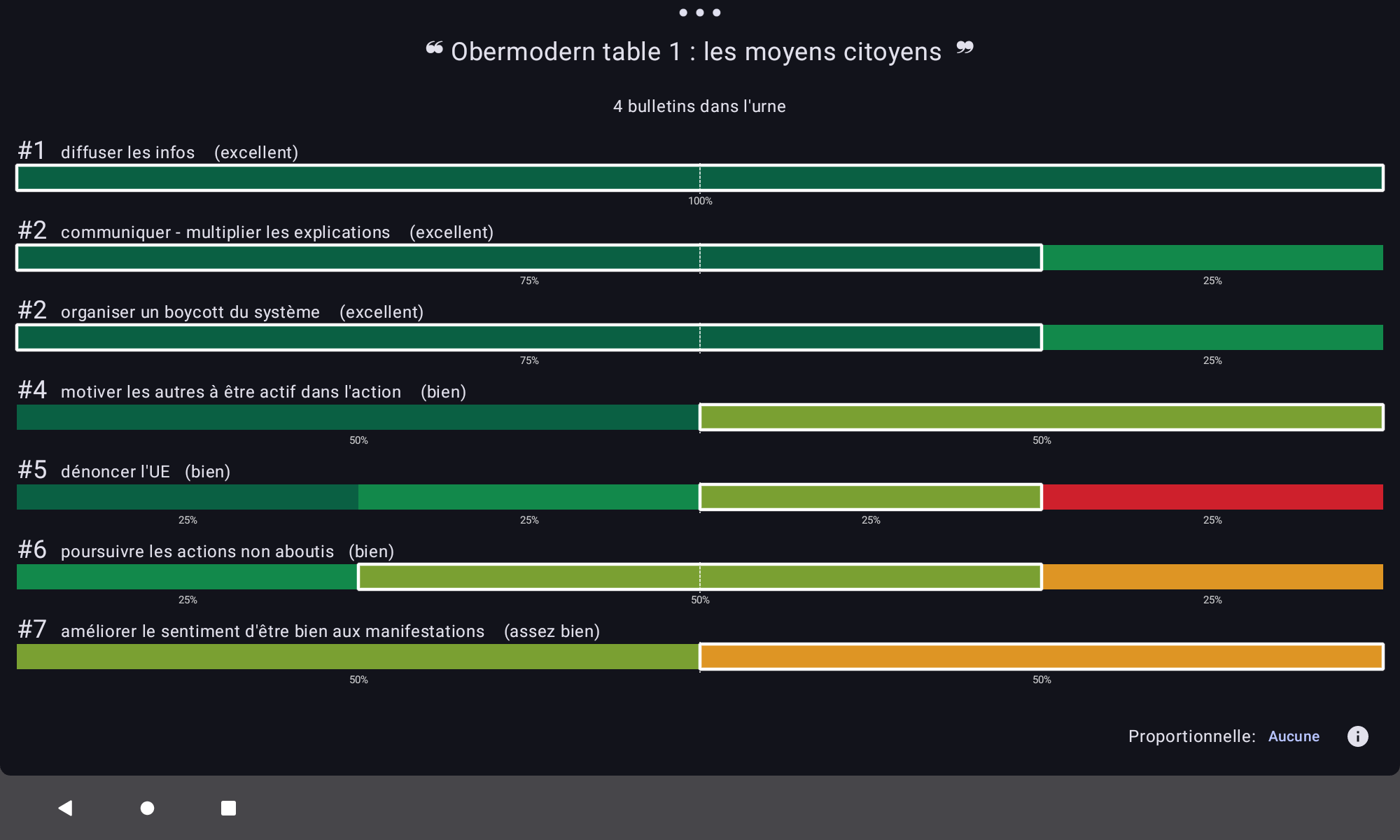 Ensuite, les propositions F « Nouveau système monétaire » et E « Provocation non violente » sont jugées majoritairement bien.